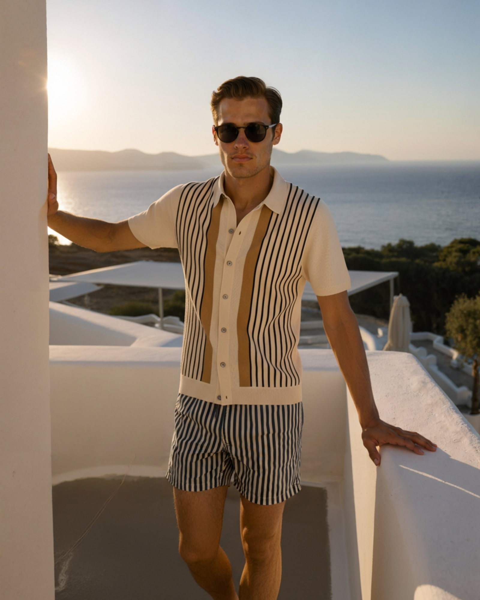 A perfect balance of retro inspiration and modern craftsmanship, this knit polo elevates everyday dressing. Designed with a lightweight feel and intricate contrast stripes, it’s ideal for warm-weather layering or refined casual wear. Pair it with tailored trousers or relaxed linen for effortless sophistication.